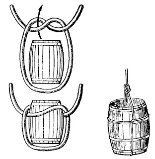 На средней части веревки, которым намерены поднимать бочку, вяжут полуузел. Полупетли узла разводят в стороны и охватывают ими среднюю часть бочки. При этом нижняя часть петли должна проходить по центру днища бочки. Свободные концы веревки связываются прямым узлом, а если веревка одним концом уже закреплена, то беседочным узлом.