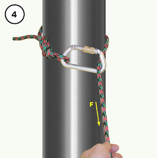 (Можно сначала обвести вокруг опоры и потом вщёлкнуть карабин.) - муфта карабина закручивается и при тяге за коренной конец верёвки узел затягивается.
